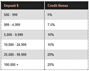 - Bonus: 25% in credit bonus for any deposit of 500 USD or greater.